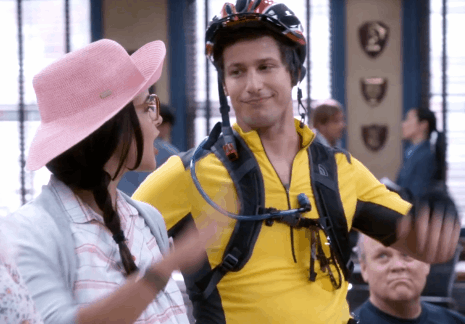Andy Samberg and Melissa Fumero give each other a high five GIF