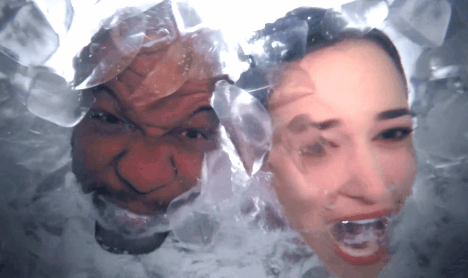 Terry Crews and Melissa Fumero dip their faces in ice water GIF
