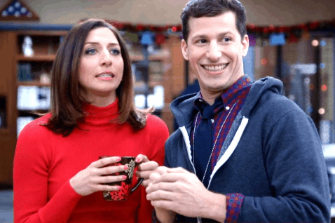 Andy Samberg and Chelsea Peretti shake hands on the deal GIF