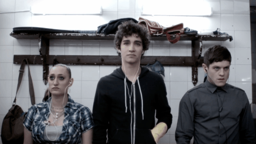 Robert Sheehan, Lauren Socha, and Iwan Rheon walk with a strut GIF
