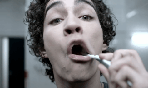 Robert Sheehan is brushing his teeth GIF