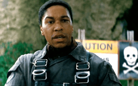 Aaron Moten takes aim with a gun GIF