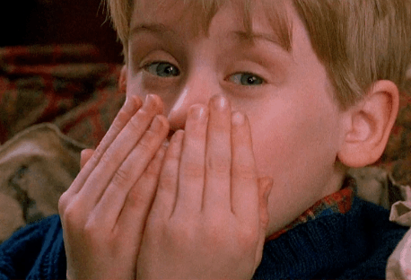 A scared Macaulay Culkin covers his eyes with his hands GIF