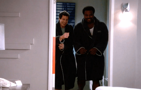 Andy Samberg and Craig Robinson dive onto the bed GIF
